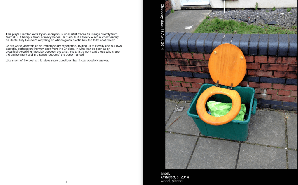It started as private joke for a handful of friends in a Facebook group. This was 2014. It went low-key viral by mistake, as people joined in with their own commentary. The local press got involved, and it accidentally snowballed to something like 10,00 people. An arts trail exhibition and book launch followed.